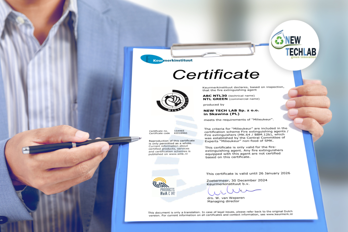 Nell’ambito della verifica di sorveglianza della certificazione, il Keurmerkinstituut ha confermato che NEW TECH LAB rispetta tutte le linee guida che rendono la nostra polvere estinguente rigenerata un prodotto ecologico. Da questo momento, il nostro prodotto di punta assume anche un nuovo nome: NTL Green.