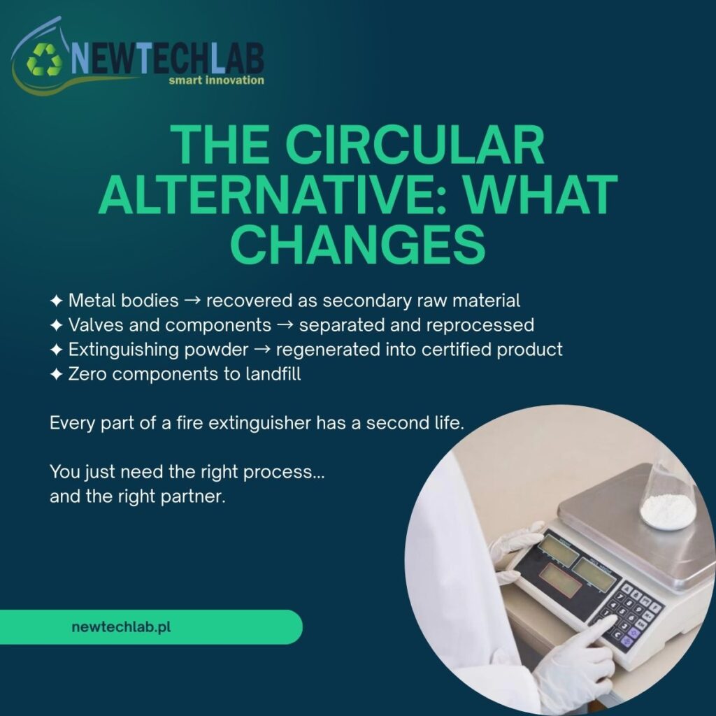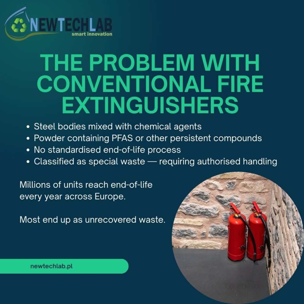 Każdego roku miliony gaśnic dobiega końca swojego okresu użytkowania w całej Europie. Są klasyfikowane jako odpady specjalne, wymagają autoryzowanego transportu i certyfikowanego unieszkodliwiania. Większość trafia na składowiska lub jest zarządzana przez procesy, które rozpraszają materiały bez ich odzysku.