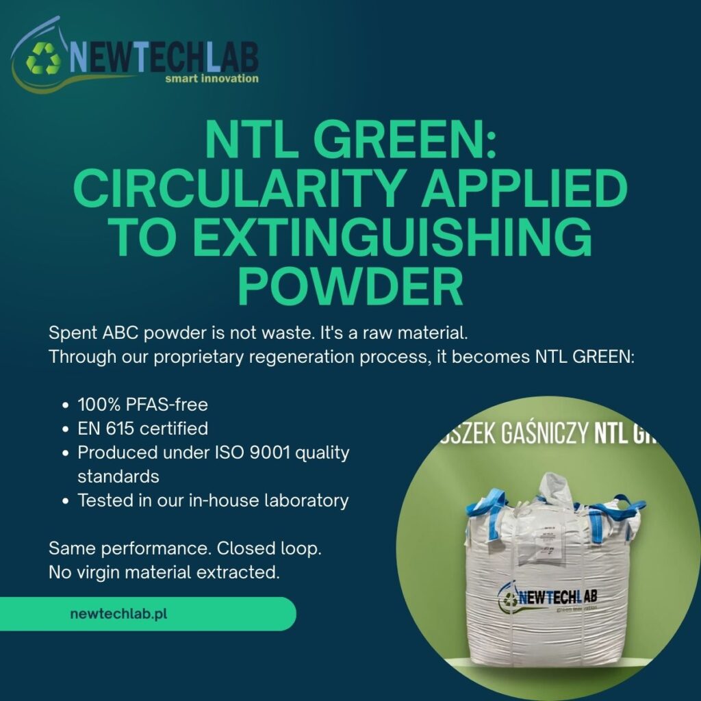 To zużyty proszek ABC, który poprzez certyfikowany proces przetwarzania i regeneracji zostaje przekształcony w produkt zgodny ze standardami normatywnymi i gotowy do użycia. Zregenerowany proszek NTL GREEN firmy NEW TECH LAB jest w 100% wolny od PFAS i certyfikowany zgodnie z EN 615.